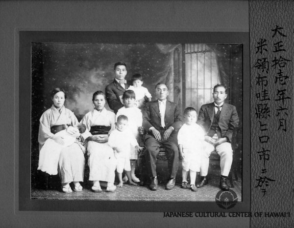 Yakichi Watanabe and family. Hilo, Hawaii Island, June 1911. Front row (L-R): Wife Fumiko (holding youngest child), mother of Yakichi, father of Yakichi, brother of Yakichi. 2nd Row: Yakichi, holding child. JCCH/Sadako Alison Yamanaka Collection.