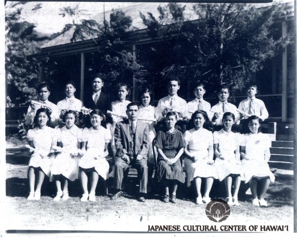 Graduating class of Waikapu Japanese School, 1940. Yakichi Watanabe, principal, and his wife, Fumiko, front row, center. JCCH/Sadako Alison Yamanaka Collection.