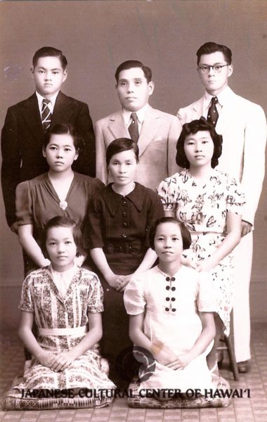 Yakichi Watanabe Family, 1938. Front row: Sueko, Hideko. 2nd Row: Sadako, Fumiko, Hiroko. 3rd Row: Brown, Yakichi, Walter. JCCH/Sadako Alison Yamanaka Collection.