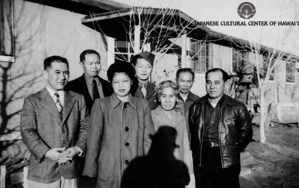Yoshiyama family with a visiting soldier from Hawaii. Jerome Concentration Camp, 1944. 1st Row (L-R): Joji, Emiko. 2nd Row: Jerry, Matsue, Takeo, Patrick Kumagai. JCCH/Jerry Yoshiyama Archival Collection.
