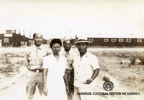Visiting soldiers from Hawaii. Jerome Concentration Camp, 1944. 1st Row: Matsue and Jerry Yoshiyama. JCCH/Jerry Yoshiyama Archival Collection.