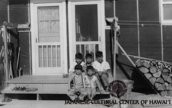 Children in front of Yoshiyama barracks, 34-07-F, Jerome Concentration Camp, ca. 1944. 2nd row (L-R): Joji (2nd), Takeo (3rd). JCCH/Jerry K. Yoshiyama Archival Collection.